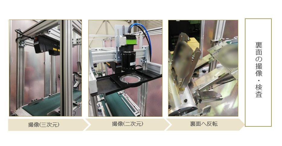 2次元と3次元データを用い、5~75μmの分解能で金属製プレス品の傷・歯曲がり・真円度などの外観と形状異常を両面検査。搬送、反転、検査、振り分け(良・不良・不明)の工程をすべて自動で行います。